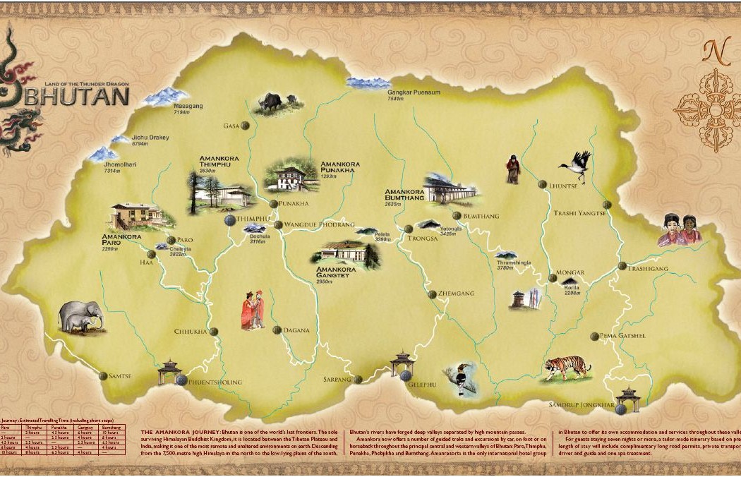 Das Amankora liegt im Zentrum des Bhumtang-Tales in der Nähe des Dorfes von Jakar. Die Architektur wurde von der Bauart der mächtigen Dzongs inspiriert. Das Resort liegt beim Wandichholing Palast, dem Geburtsort der Monarchie Bhutans.