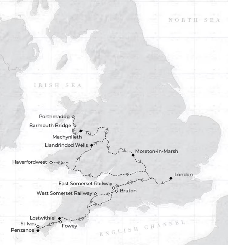 Diese Reiseroute lädt Sie ein, sechs luxuriöse Nächte lang das sandige Cornwall und das idyllische Wales zu erkunden und zu lieben. Zuerst reisen wir nach Cornwall und erkunden die berühmten Orte dieser sagenumwobenen Grafschaft, darunter Penzance und Lostwithiel. Anschließend freuen Sie sich auf die malerischen Dörfer, üppigen Täler und das grüne Kaleidoskop von Wales, bekannt als das Land des Roten Drachens. Dies ist Zugreisen vom Feinsten.