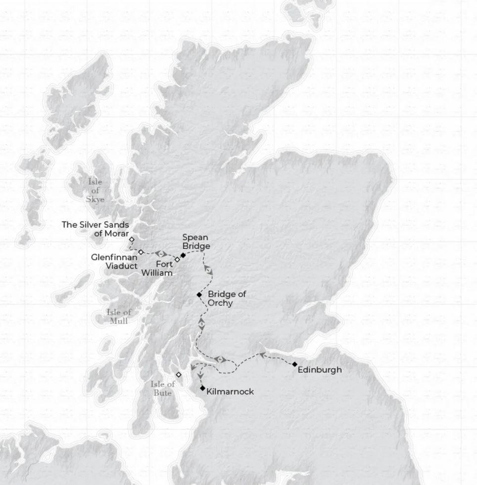 Der Royal Scotsman verlässt Edinburgh am frühen Nachmittag und fährt westwärts über Falkirk nach Craigendoran, wo er auf die berühmte West Highland Line wechselt.