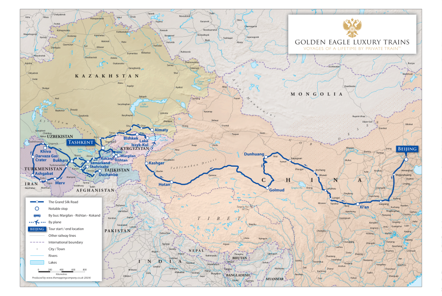BEIJING – XI’AN – DUNHUANG – GOLMUD – HOTAN – KASHGAR – ALMATY – LAKE ISSYK-KUL – BISHKEK – TASHKENT – BUKHARA – MERV – ASHGABAT – DARVAZA – KHIVA – SHAHRIZABZ – DUSHANBE – SAMARKAND – MARGILAN – RISHTAN – KOKAND – TASHKENT