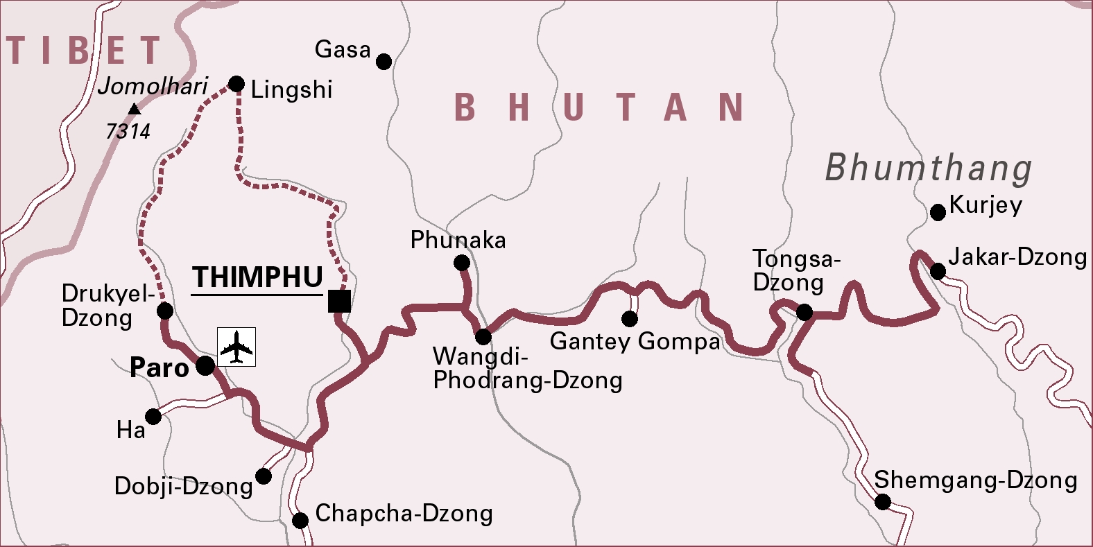 Gibt es dieses Paradies, genannt Shangri-La, wirklich? Falls ja, könnte es durchaus in Bhutan sein. Bhutan, das von seinen Bewohnern Druk Yül (Land des Donnerdrachens) genannt wird, gehört zu den lebendigen Beispielen einer intakten Kultur und Umwelt. Verborgen im östlichen Himalaya und zwischen zwei mächtigen Nachbarn (Indien und Tibet/China) gelegen, etwas grösser als die Schweiz, aber mit einer viel kleineren Bevölkerungsdichte, ist Bhutan «das Land, das einen magischen Charme verströmt», wie seine Verehrer sagen. Die Schönheit der Landschaft erscheint für den Besucher aus der industrialisierten Welt manchmal unwirklich: Häuser mit kunstvoll geschnitzten Fensterrahmen und Schindeldächern, Patchwork von grünen Reisfeldern, dichte Eichenwälder, Parzellen mit goldfarbenem Buchweizen, gedeckte Holzbrücken, Zäune aus kunstvoll geflochtenem Bambus, Frauen, die unter freiem Himmel Textilien weben, Pferdekarawanen mit Nachschub für abgelegene Orte, durchs Gehölz von riesigem Rhododendron streifende Yaks. Solche Begegnungen und Erlebnisse sind bleibende Erinnerungen. Die tiefsten Eindrücke jedoch hinterlassen die Symbole des religiösen Lebens in Bhutan: Über die Landschaft verteilte Chörten, im Wind wehende Gebetsfahnen, von Gebirgsbächen angetriebene grosse Gebetsmühlen, die Tempel und natürlich die Wahrzeichen von Bhutan: die Dzongs, Klosterburgen, die an strategisch wichtigen Orten erbaut wurden. Der Buddhismus ist allgegenwärtig, das tägliche Leben und die Geisteshaltung bestimmend.