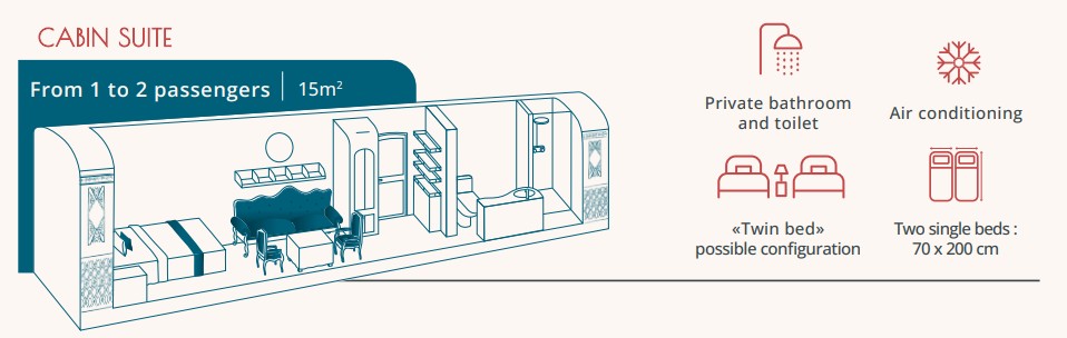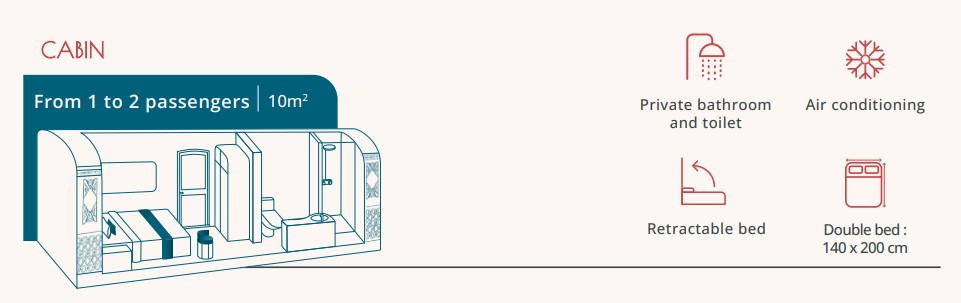 Tagsüber sind sie private Salons, nachts werden sie zu Schlafzimmern mit unvergleichlichem Komfort, die sich ganz nach Ihren Wünschen verwandeln. Die geräumigen Kabinen können auf verschiedene Weise eingerichtet werden, um Ihnen eine perfekte Nachtruhe zu garantieren.