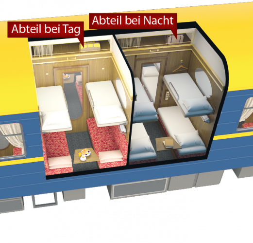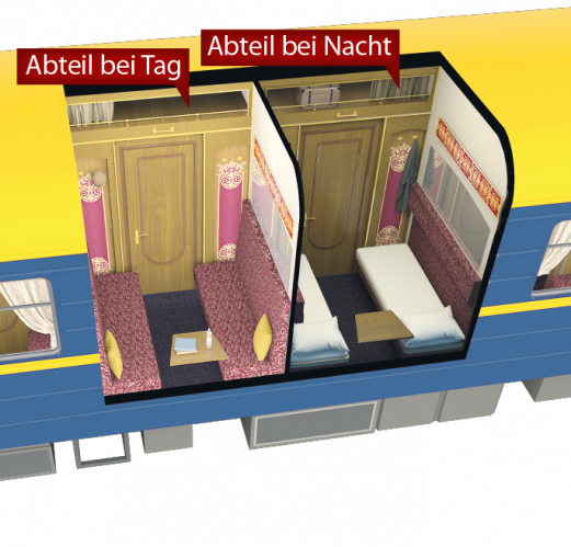 In der Kategorie Standard teilen sich jeweils vier Gäste ein Abteil (gemischtes Abteil möglich). Je zwei Betten à ca. 68 × 187 cm sind übereinander angeordnet, in der Mitte unter dem Fenster gibt es einen Tisch. Um etwas mehr Platz zu haben, gibt es in dieser Kategorie gegen Aufpreis die Möglichkeit, das 4-Bett-Abteil mit 3 Personen zu belegen. Der Wagen hat 9 Abteile. An beiden Waggonenden befinden sich kombinierte Wasch- und Toilettenräume.